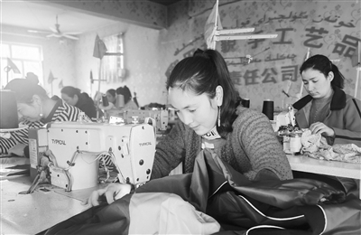 3月9日,“花貌”手工艺品有限公司女员工正为完成2500套订单服装而忙碌着。地区融媒记者 古哈尔摄
