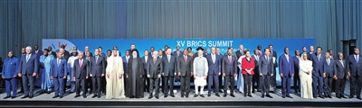 当地时间8月24日上午,国家主席习近平在约翰内斯堡出席金砖国家同非洲国家及其他新兴市场和发展中国家领导人对话会。 会议由南非总统拉马福萨主持,巴西总统卢拉、印度总理莫迪、俄罗斯总统普京(线上)和60多位非洲国家及其他新兴市场和发展中国家领导人或代表,以及联合国秘书长古特雷斯、新开发银行行长罗塞夫等国际和地区组织负责人出席。这是与会领导人集体合影。 新华社记者 李学仁摄