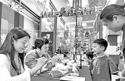 8月23日,小朋友在2023“新疆是个好地方”对口援疆19省市非物质文化遗产展“指尖非遗”展台前和泰山面塑传承人互动。石榴云/新疆日报记者 邹懿摄