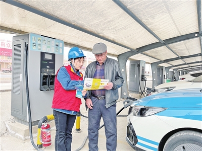 3月12日,国网和田供电公司营销服务中心服务队为新能源车主讲解安全充电常识。地区融媒记者 董瑞强摄