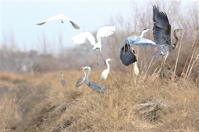 大白鹭和苍鹭在湿地附近休憩觅食。地区融媒通讯员 陈文杰摄