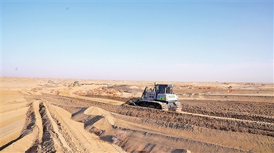 ➡ 1月13日,在墨玉县雅瓦乡2.2万亩治沙现场,大型机械在沙地中穿梭作业。