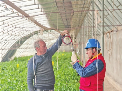 国网策勒县供电公司工作人员在津南新村辣椒种植大棚内帮助村民排查大棚用电线路、供电设施安全隐患。