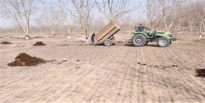 2月7日,在和田县英阿瓦提乡刀郎村的农田里,拖拉机、三轮车满载着农家肥来回穿梭,田间地头一片繁忙景象。