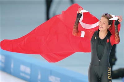 2月10日,杨滨瑜在赛后庆祝。 当日,第九届亚冬会速度滑冰女子3000米决赛在哈尔滨举行。中国选手杨滨瑜、韩梅、太智恩分别获得冠、亚、季军。 新华社记者 王建威摄