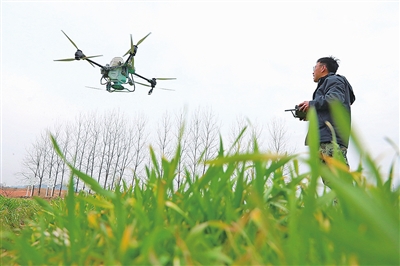 在浙江省杭州市,临安区天目山镇“天目粮仓”的农机人员,通过遥控植保无人机给小麦施肥。