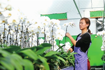 在山东省平度市,旧店镇万汇蝴蝶兰产业园的智能花卉温室里大片蝴蝶兰盛开,工人们忙着管护和加工鲜切花,供应国内外市场。