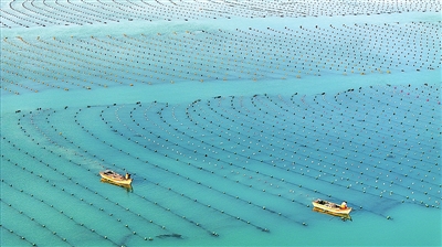 在山东省荣成市,海洋牧场的养殖工人驾驶养殖船开展海带春管、贝类养殖、浮漂更换等海上生产作业,呈现出一派“海上春耕”的繁忙景象。