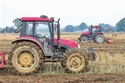 在江西省吉安市,农民翻耕整地,进行春播春种。