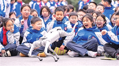 2月17日,四川眉山市彭山区第二中学学生在开学第一课科普活动上观看机器狗表演。