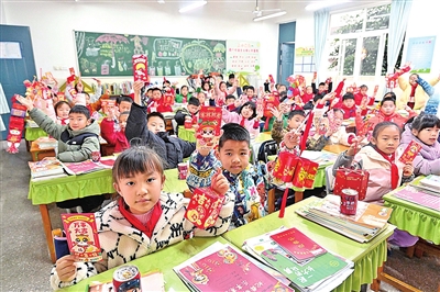 2月17日,广西柳州市德润小学的学生展示他们制作的灯笼。