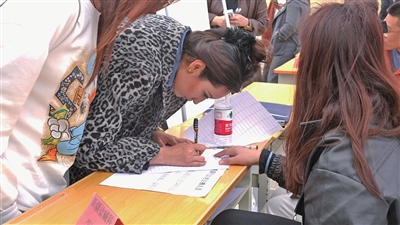 3月14日,在招聘会现场,求职者填写入职意愿表。