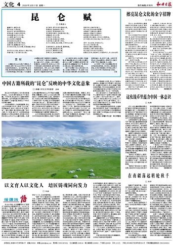 昆仑在中华民族的心目中具有崇高的地位。它在先秦时期始见于中国古籍。千百年来,昆仑成为文人骚客争相吟诵的对象。在中华民族历史发展长河中,昆仑被赋予了多重内涵,映射出了中华文化的博大精深。