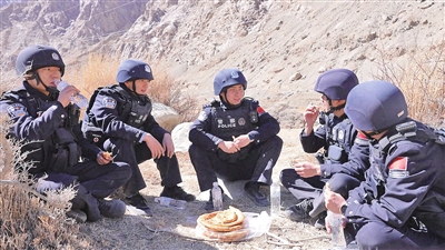 巡边途中,馕加矿泉水就是民警的午餐。地区融媒记者 杨祝摄