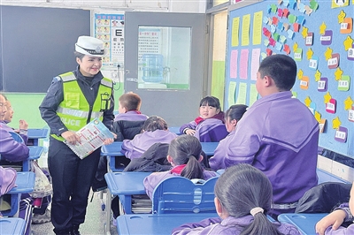 “这个大大的感叹号告诉我们前方有危险,要注意安全;乘坐电动车上下学,要正确佩戴安全头盔;红灯停、绿灯行,黄灯亮了等一等,大家说对不对?”宣讲中,民警通过图文并茂的讲解,引导学生提高安全意识。