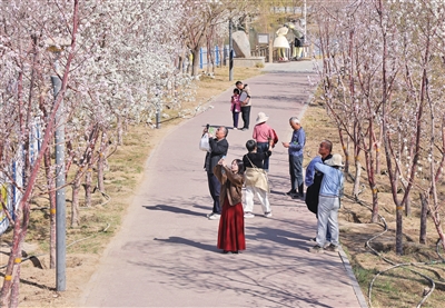 三月二十六日,市民在和田市昆仑湖公园赏花、拍照。