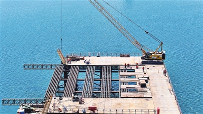 4月30日,在潍宿高铁山东郯城段,中铁上海局的工作人员在进行沭河特大桥施工(无人机照片)。