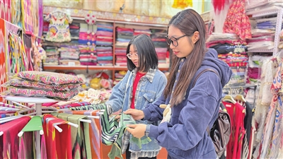 游客在和田团城景区挑选艾德莱斯绸。地区融媒记者 努尔古再丽摄
