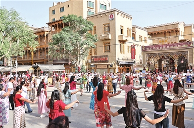 地区融媒讯 (记者 努尔古再丽 阿卜力克木 阿巴拜科日 惠丰蕾 许晓龙)6月6日,和田团城景区热闹非凡,各族群众身着节日盛装,用麦西热甫舞蹈欢庆节日,人潮中游客与市民共舞,欢度节日。
