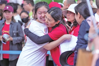 6月7日,在哈尔滨市第九中学考点,考生走入考场前与老师拥抱。