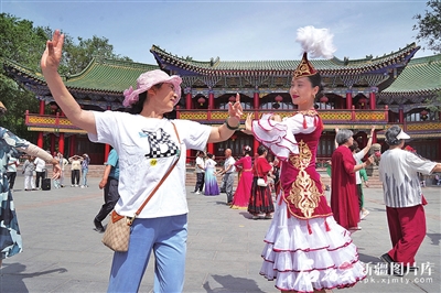 6月5日,乌鲁木齐市人民公园朝阳阁广场上,来自沙依巴克区的专业舞蹈演员带着市民和游客一起欢快起舞。 6月5日,在乌鲁木齐市的9个户外场地同步开展了“欢聚在一起 同跳一支舞”快闪活动,邀请各族群众和游客快乐跳起来。 这次活动由乌鲁木齐市委统战部和新疆生产建设兵团第十二师党委统战部联合发起,以“中华民族一家亲 同心共筑中国梦”为主题,采用同跳一支舞、同唱一首歌的方式,以15分钟快闪的形式进行表演和互动,促进各民族交往交流交融。 石榴云/新疆日报记者 张万德摄