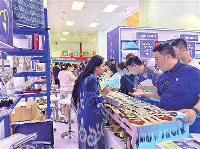 展会现场,和田展区成为人气焦点。非遗系列产品中,艾德莱斯绸拥有着绚丽色彩、手工羊毛地毯用细密针脚编织着独特纹样,精湛的手工技艺展现和田传统产品的魅力;全新推出的“五星出东方”系列产品,将和田元素与现代时尚巧妙融合,文创饰品、家居好物等兼具艺术性与实用性;和田玉系列产品更是璀璨夺目,温润玉质与精美雕工相得益彰。