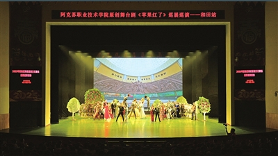 阿克苏职业技术学院巡演队伍带着精品舞台剧《苹果红了》走进地区影剧院。