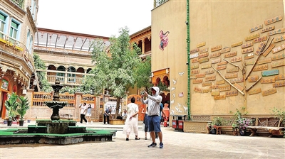 7月10日,笔者在和田团城看到,熙熙攘攘的游客穿梭在街巷中;“阿依旺”独特的建筑风格引得众多游客与市民驻足拍照;而在特色手工艺品店面门口,商户热情地向游客介绍着产品的制作工艺与背后的文化内涵。纳尔巴格街道民心社区居民阿米娜·吉力力是北京援疆团城改造项目的直接受益者之一,她们一家借助团城改造带来的机遇,将自家庭院进行了改造升级,经营起特色民宿,吃上了红火的“旅游饭”,日子越过越有奔头。