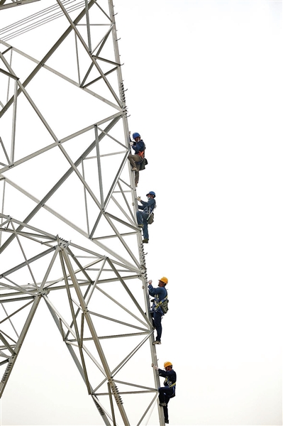 2021年8月26日,莎车-和田Ⅱ回750千伏输电线路工程3057号塔至2058号塔之间,电力工人仔细进行工程验收。