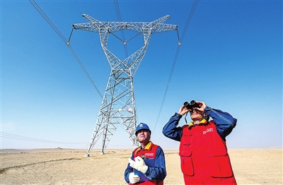 2023年2月13日,国网墨玉县供电公司萨依巴格乡供电所员工查看沙漠、戈壁地段的750千伏车和(莎车至和田)一、二线的运行安全情况。