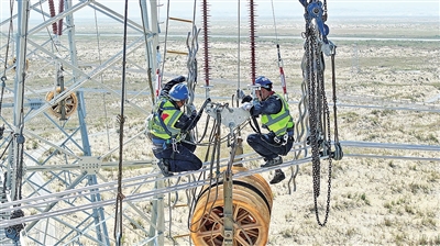 2025年7月13日,在民丰县萨勒吾则克乡的188号铁塔下,最后一相导线缓缓穿出。