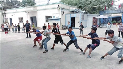 巴格其镇也孜巴格村组织孩子们开展拔河活动。