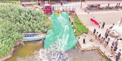 在波光粼粼的龙湖,工作人员将一袋袋活蹦乱跳的鱼苗缓缓倾入湖中,银光闪烁的鱼群迅速游向湖心。“此次投放鱼苗不仅能补充水生生物资源、改善水体食物链结构,还能通过摄食藻类等净化水质,是一举多得的生态保护举措。”于田县农业农村局干部张美云解释道,通过“以鱼养水、以鱼护水”的生态修复模式,可进一步优化龙湖水域生态系统,增强水体自净能力,同时提升群众对水生态保护的认知度与参与度。