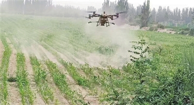 “以前给300亩玉米打药,全家齐上阵,背着药桶往闷热的玉米地里钻,一干就是好几天,又累又不安全,身上还一股药味。”村里的种植大户库尔班·买买提看着无人机作业,笑意满面,“现在这‘小飞机’一会儿就弄完了,人站在地头凉快着就把活干了,省时省力还安全。”