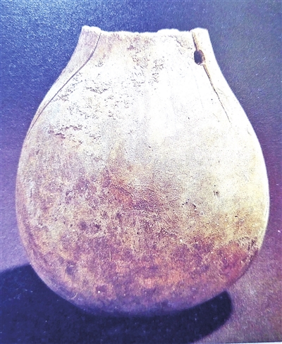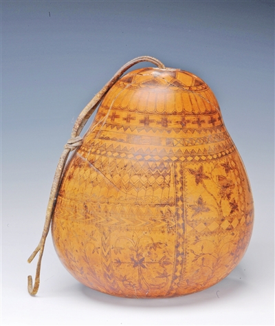 和田是塔克拉玛干沙漠与昆仑山脉之间的一片绿洲, 自古以来,葫芦深受古代和田各族人民的广泛喜爱。和田汉晋时期的尼雅遗址、山普拉墓葬、墨玉县吐扎克其墓地、策勒达玛沟佛寺遗址采集到葫芦器物,大多数的葫芦经过切割、钻孔等加工。1984年和1992年,和田山普拉古墓葬考古发掘出土3件葫芦瓶。裁取植物葫芦小头做口,器形呈小平口、鼓腹、圆底瓶状。器口两则钻有对称系的绳孔。高16厘米,一系孔缺失,一系孔径0.6厘米。这件完整的葫芦是汉代于阗人种植葫芦的证明。从古至今,葫芦一直是和田地区种植的作物种类。