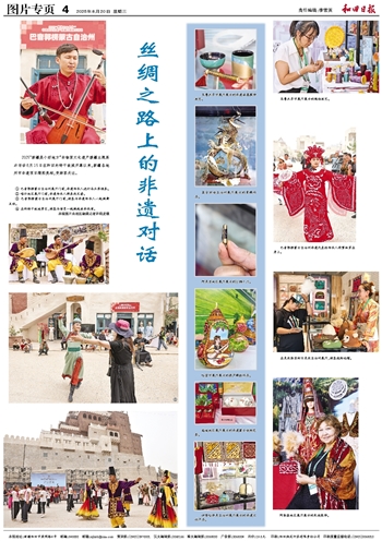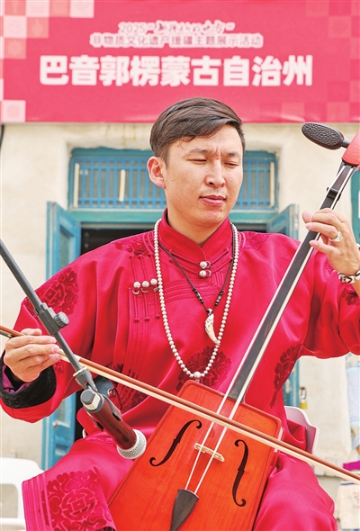 ① 巴音郭楞蒙古自治州展厅门前,非遗传承人进行马头琴演奏。