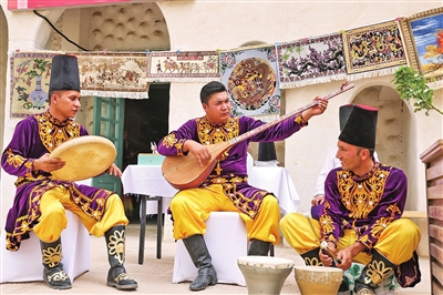 ② 喀什地区展厅门前,非遗传承人弹奏热瓦普。