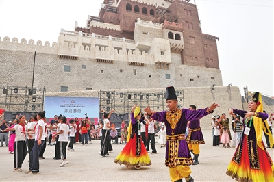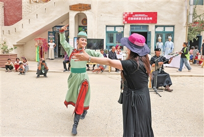 ④ 在约特干故城景区,游客与演员一起跳起麦西热甫。
