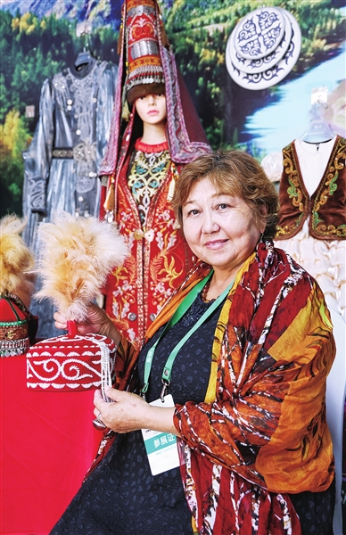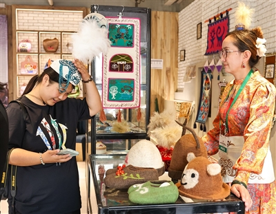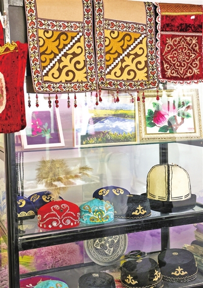 伊犁哈萨克自治州展厅展示的非遗文创产品。