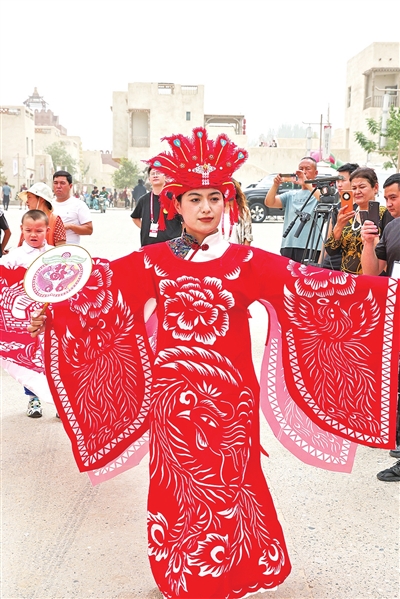 巴音郭楞蒙古自治州非遗代表性传承人将剪纸穿在身上。