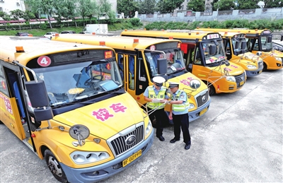 8月25日,湖北省襄阳市保康县公安局交警大队民警对校车进行安全检查(无人机照片)。