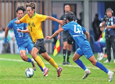 11月12日,湖北队球员孙康博(左二)在比赛中进攻。 当日,在广东深圳举行的第十五届全国运动会足球项目男子20岁以下组金牌赛中,湖北队以6比4的总比分战胜广东队,夺得冠军。 新华社记者 郝源摄