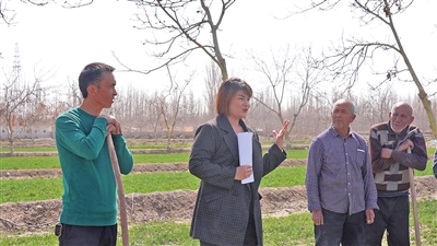 如克亚木·麦提赛地在田间地头为群众宣讲全国两会精神。受访者供图