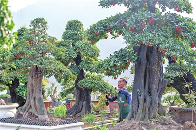 12月10日,在湖北省宜昌市长阳土家族自治县高家堰镇高家堰村,村民涂常兵在修剪院中盆景。