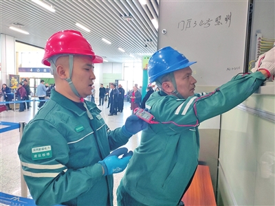 工作人员在和田昆冈机场大厅测量配电箱电流和电压。