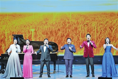 王宏伟(右三)携天津音乐学院师生在舞台上放声高歌。地区融媒记者 古哈尔尼沙摄