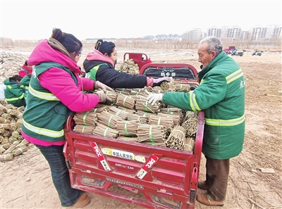 绿化工人在整理成捆的紫穗槐枝条。