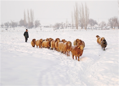 1月13日,牧民在新疆阿勒泰市阿苇滩镇雪都村牧羊。