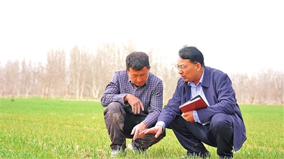 农技人员深入田间地头,指导农户开展冬小麦田间管理工作。