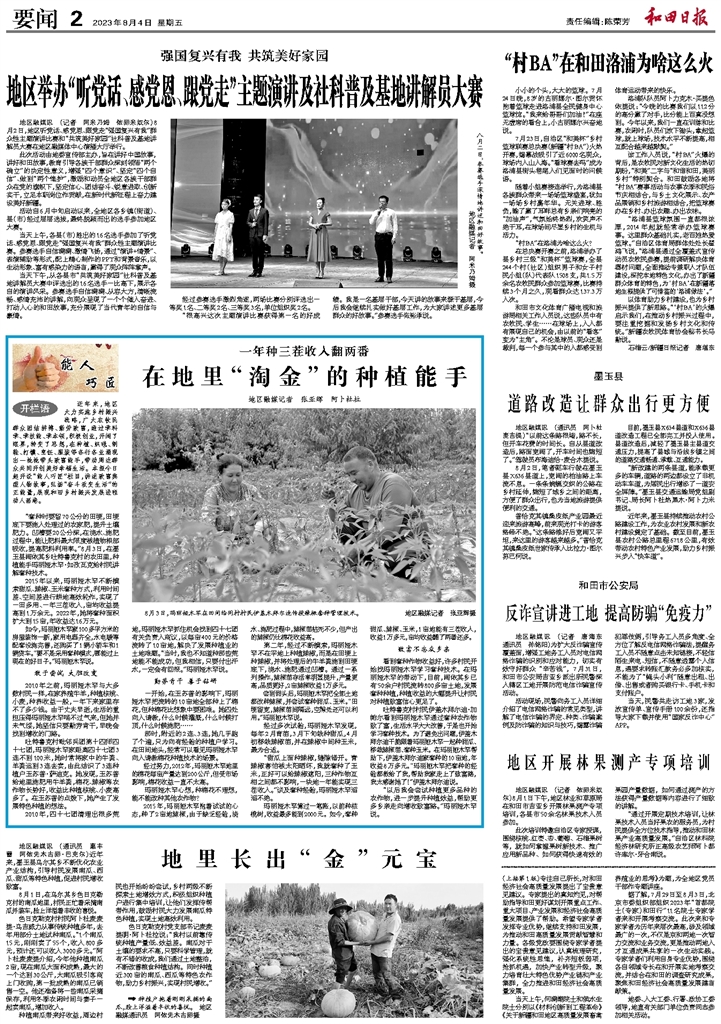 - 在地里“淘金”的种植能手 “套种时要留70公分的田埂,田埂底下要施入处理过的农家肥,提升土壤肥力。凹槽要20公分深,在浇水、施肥过程中,能让肥料最大限度被植物根部吸收,提高肥料利用率。”8月3日,在墨玉县阔依其乡吐特鲁克村